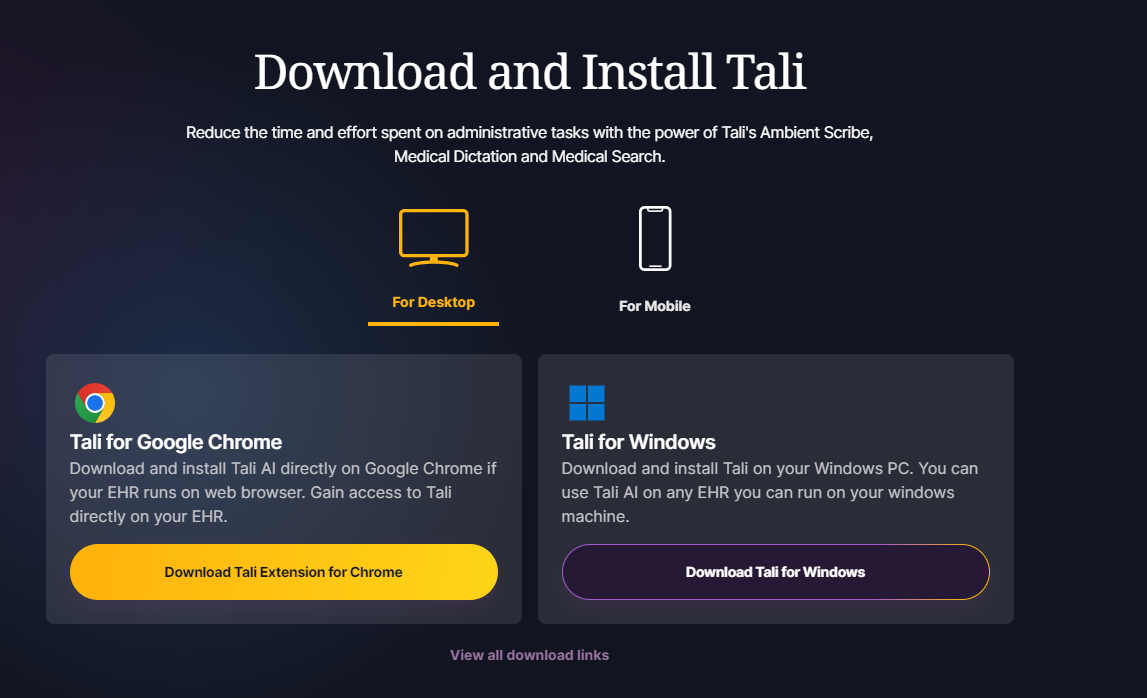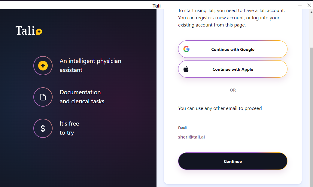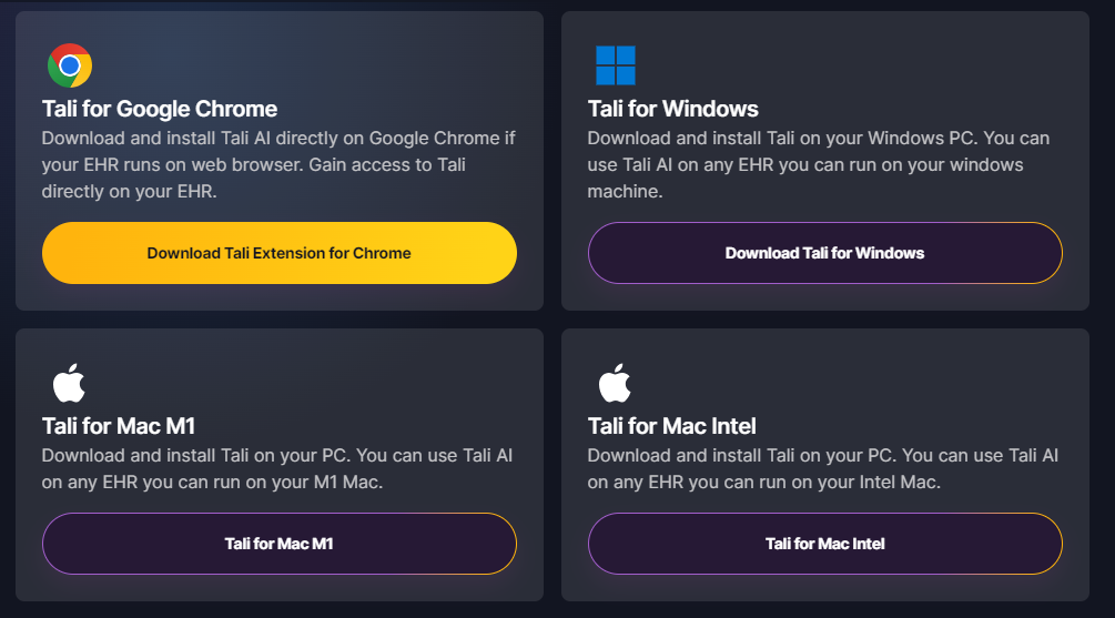 Tali's Desktop App is designed for users who want the flexibility of running Tali AI independently of other applications on their desktop. You may want to run it along side your EHR desktop application, or you may just want Tali out of the way when you're working in your EHR web application.
