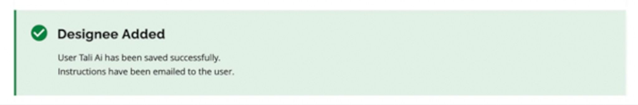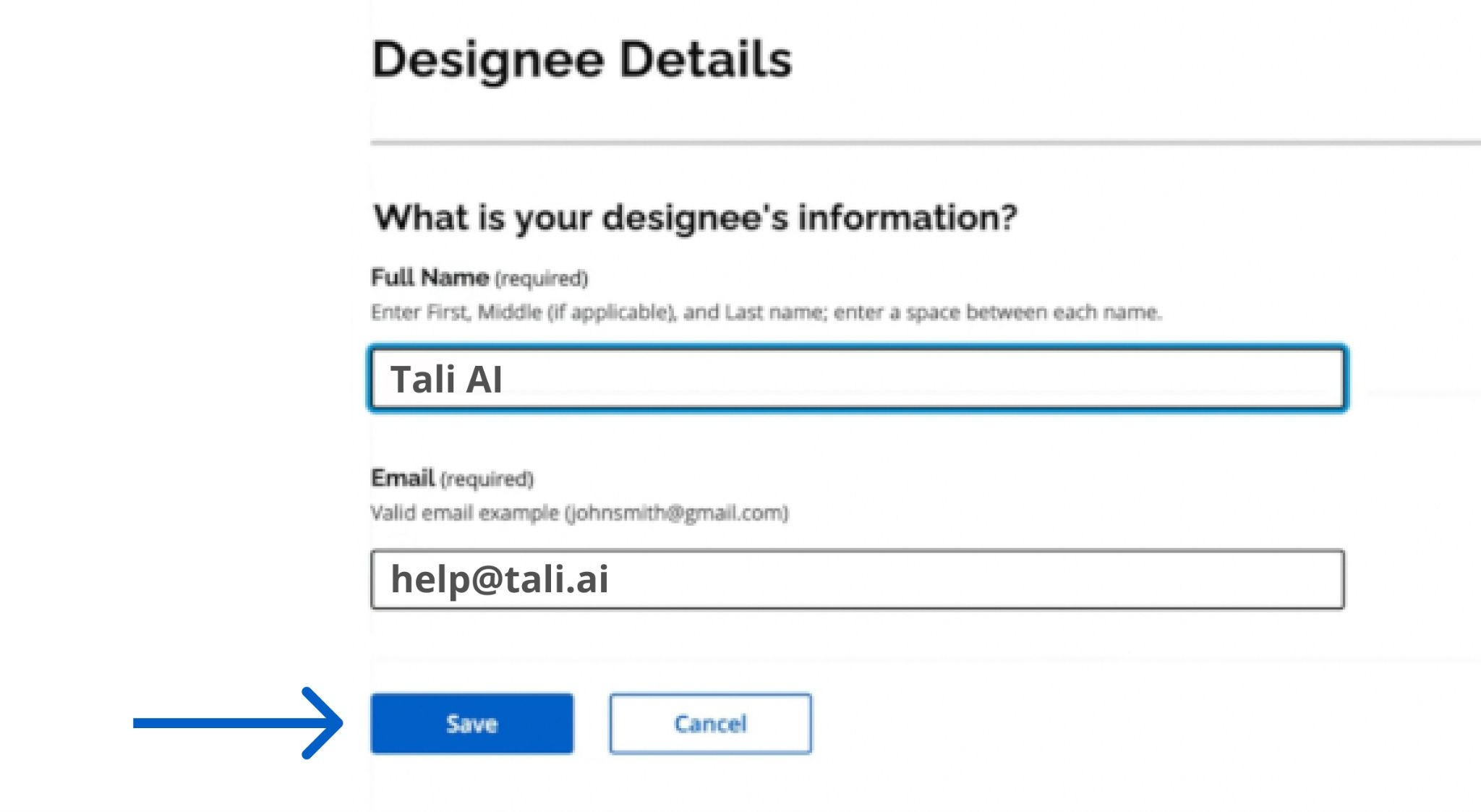 - You will -> Set Tali as a designee (takes about 1 minute)