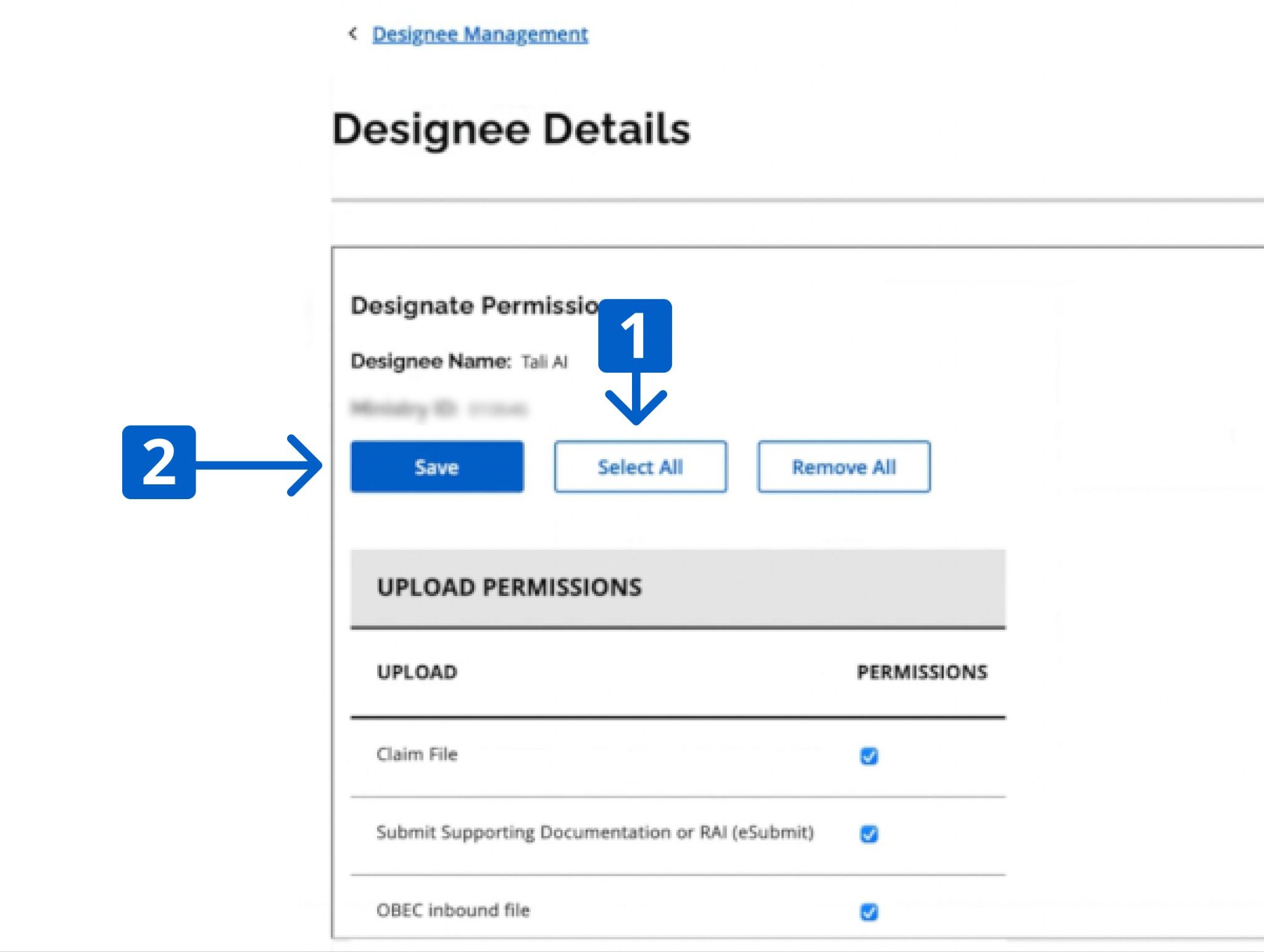 - In the Designee Details page, first click on the button labeled Select All, then click on the Save button.