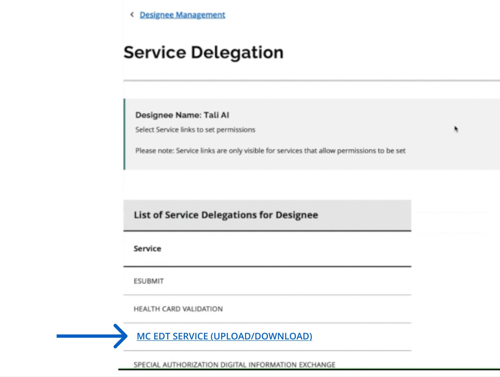 - In the Services table, the link labeled MC EDT SERVICE (UPLOAD/DOWNLOAD), and click on the label.