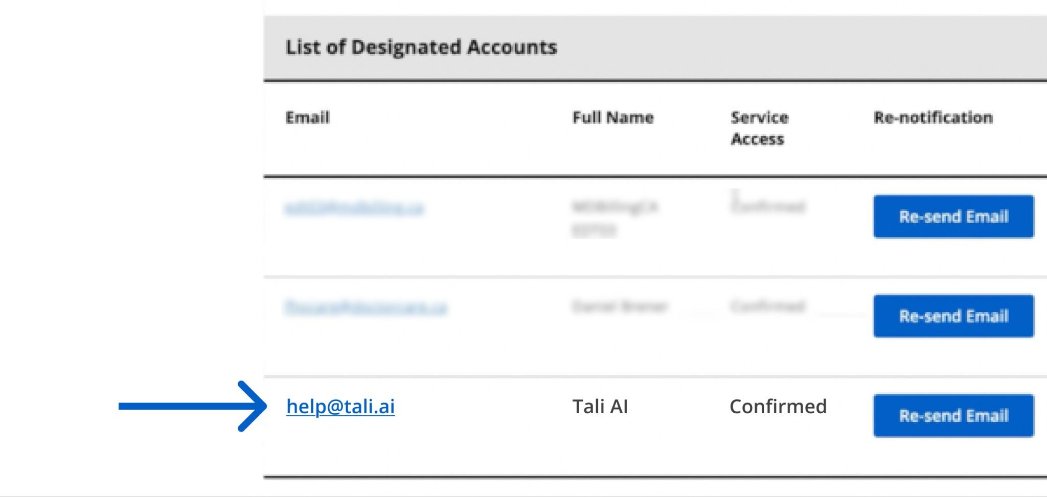 - Scroll down and find help@tali.ai email in the table, click on the email.