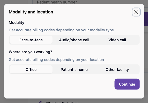 - Choose the visit modality by clicking the "Face-to-Face" button and selecting the appropriate option.