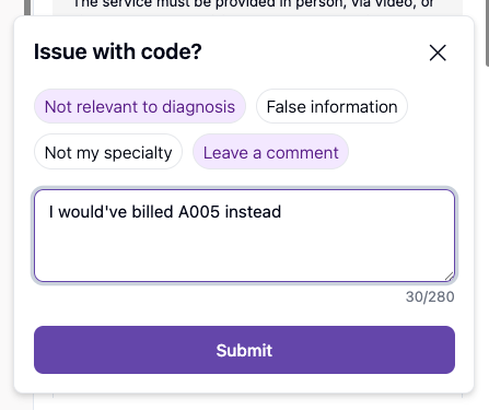 - Choose the reason for your feedback, and write additional info to help the Tali team better understand how to improve the billing agent.