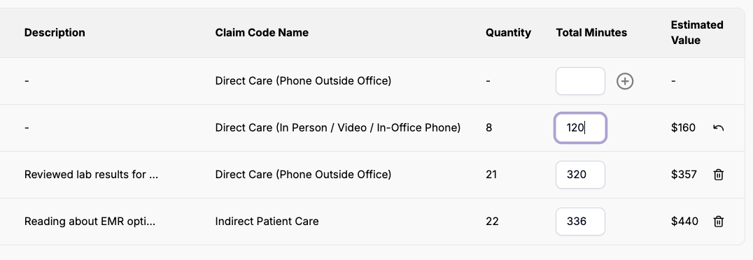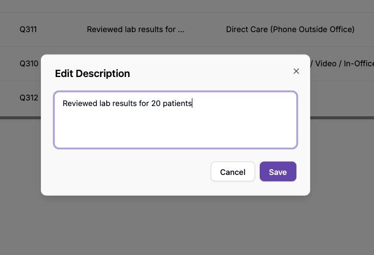 - Type a concise summary of the work performed (e.g., “Reviewed lab results for 20 patients”).