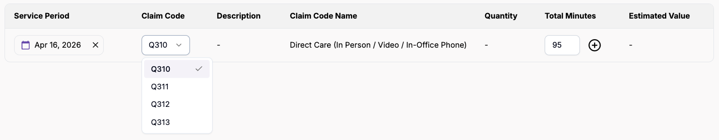 - Choose the type of code (Q310 or Q311 for Direct care, Q312 for Indirect care or Q313 for Clinical Administrative Task).