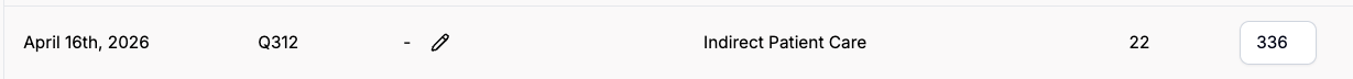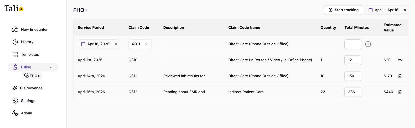 - Review the table showing daily totals for direct care Q-codes (q310 and q311) automatically calculated from your encounters.