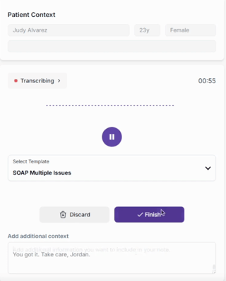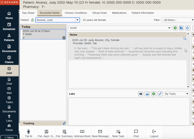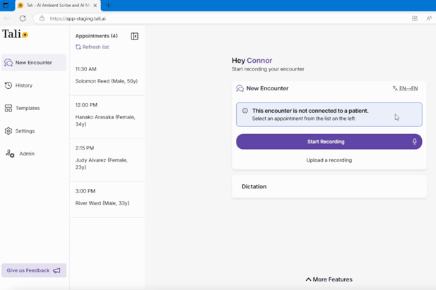 - Select the appointment to link Tali to the patient's chart. The patient's context will appear.