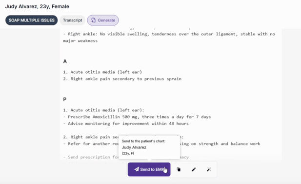 - Once you are satisfied with the note, click Send to EMR. Tali will post the note directly to the patient's chart.