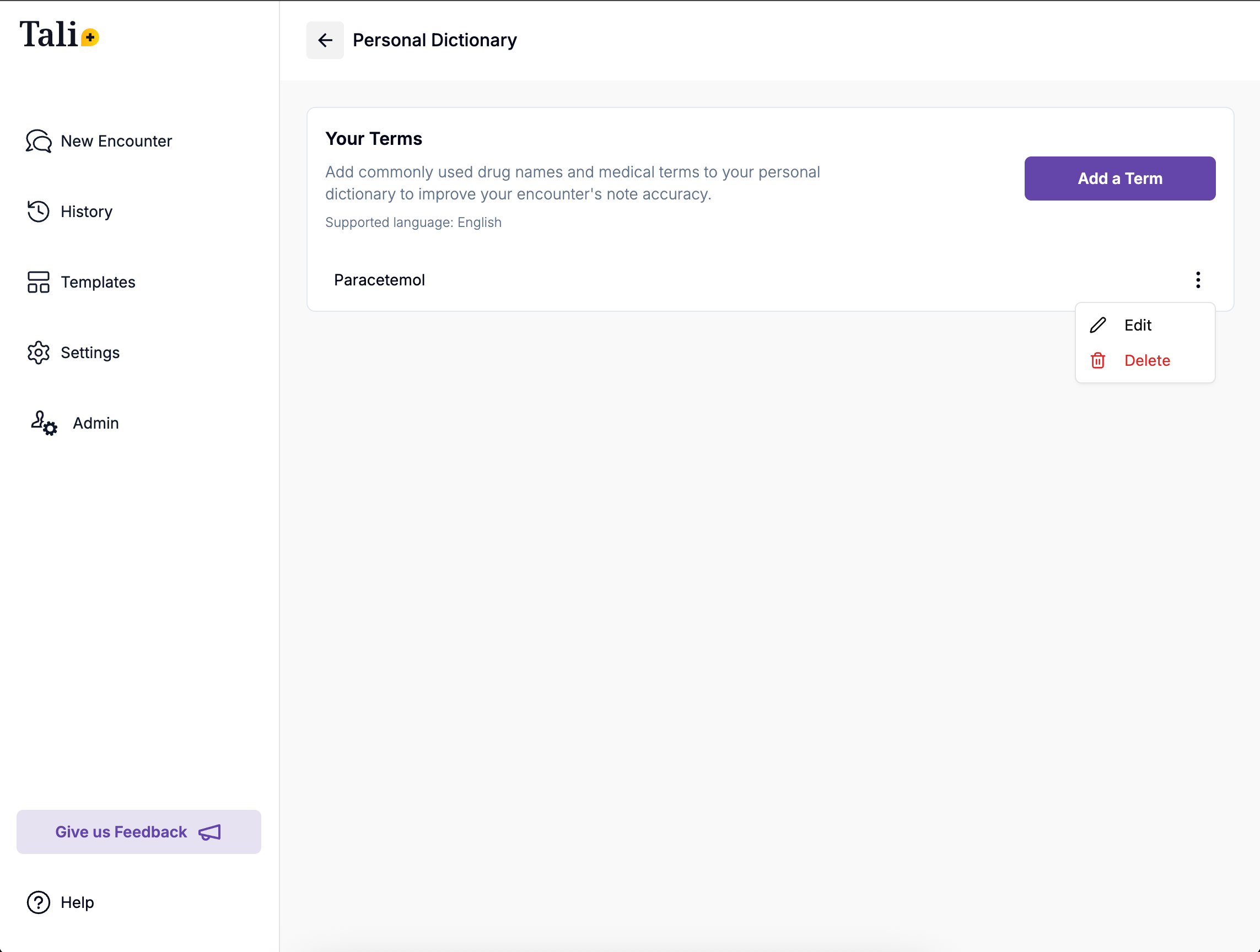 Si vous devez modifier fréquemment certains mots ou expressions courants dans vos notes, vous pouvez les ajouter à votre dictionnaire personnel. Cela permettra à Tali de comprendre l'un de vos noms les plus courants et vous fera gagner du temps lors de la modification de vos notes après la rencontre.