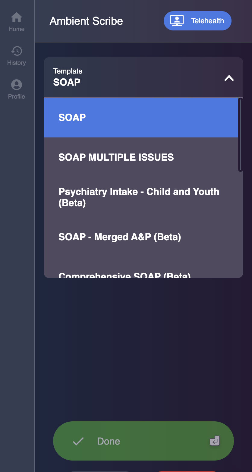 Une fois que vous avez commencé l’enregistrement avec AI Scribe, vous verrez un menu déroulant de modèles à l’écran. Cliquez sur ce menu pour sélectionner le modèle que vous souhaitez utiliser pour créer la note.