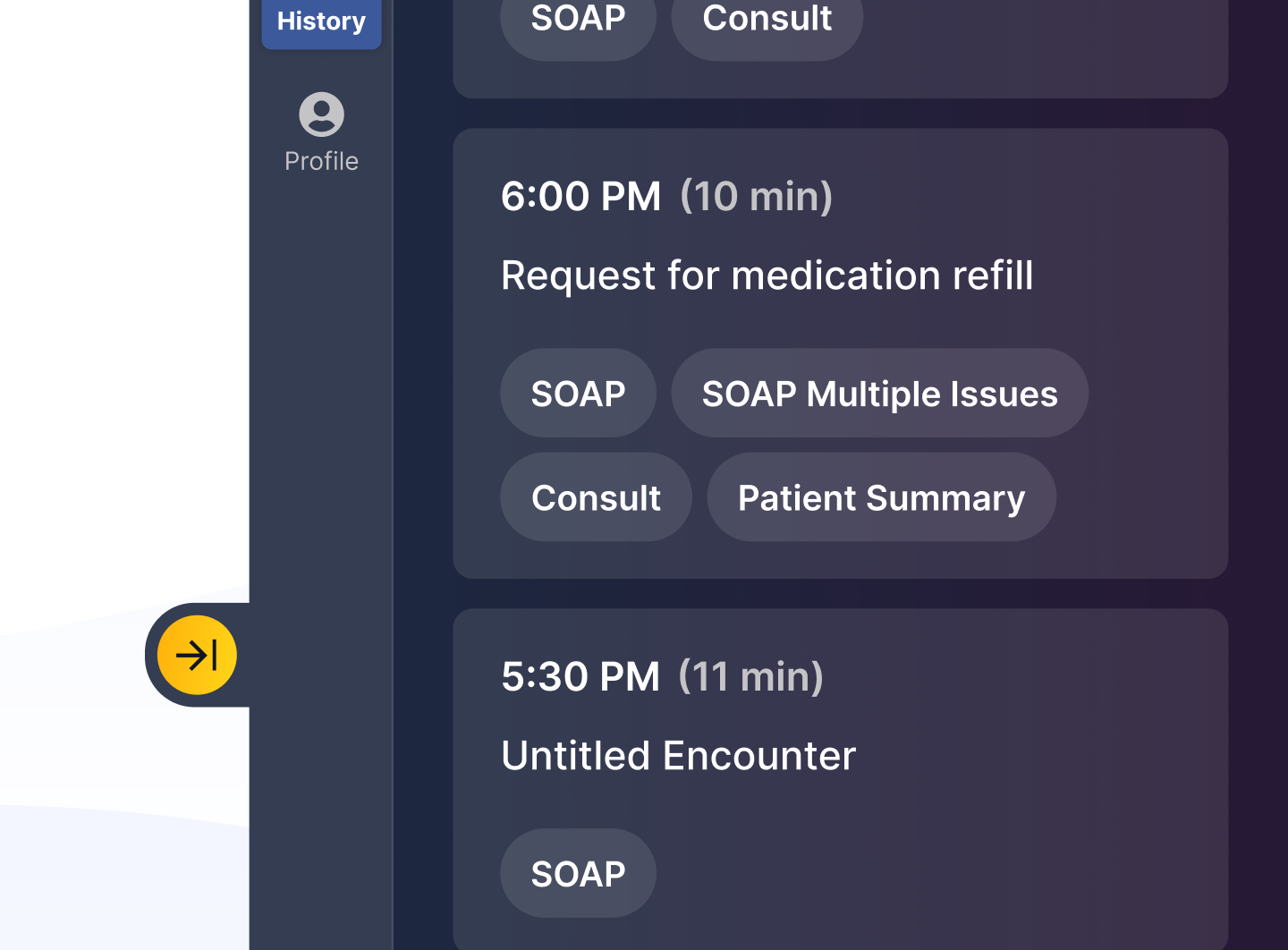 En cliquant sur ce bouton, vous accéderez à toutes les notes générées et dictées, listées sous forme de rencontres.