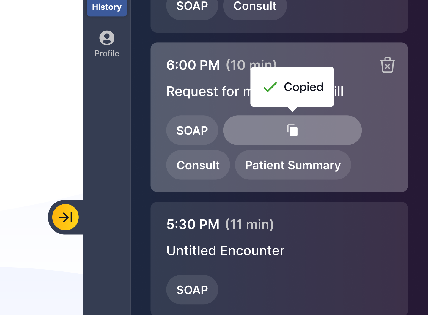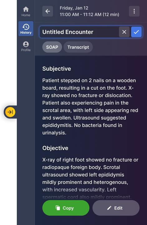 En cliquant sur une rencontre provenant d’une conversation avec un patient, vous verrez la note générée ainsi que la transcription. Si vous avez généré un ou plusieurs types de notes à partir d’une conversation avec un patient, vous pourrez voir toutes ces notes dans la vue de la rencontre afin de pouvoir les copier facilement au besoin.