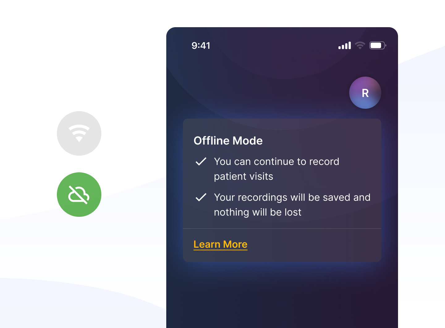 L'enregistrement hors ligne signifie que l'audio de votre visite est toujours disponible, même si votre appareil perd la connectivité réseau. Nous savons qu'un mauvais wifi peut affecter les utilisateurs de Tali dans certaines cliniques, entraînant des notes confuses ou incomplètes.