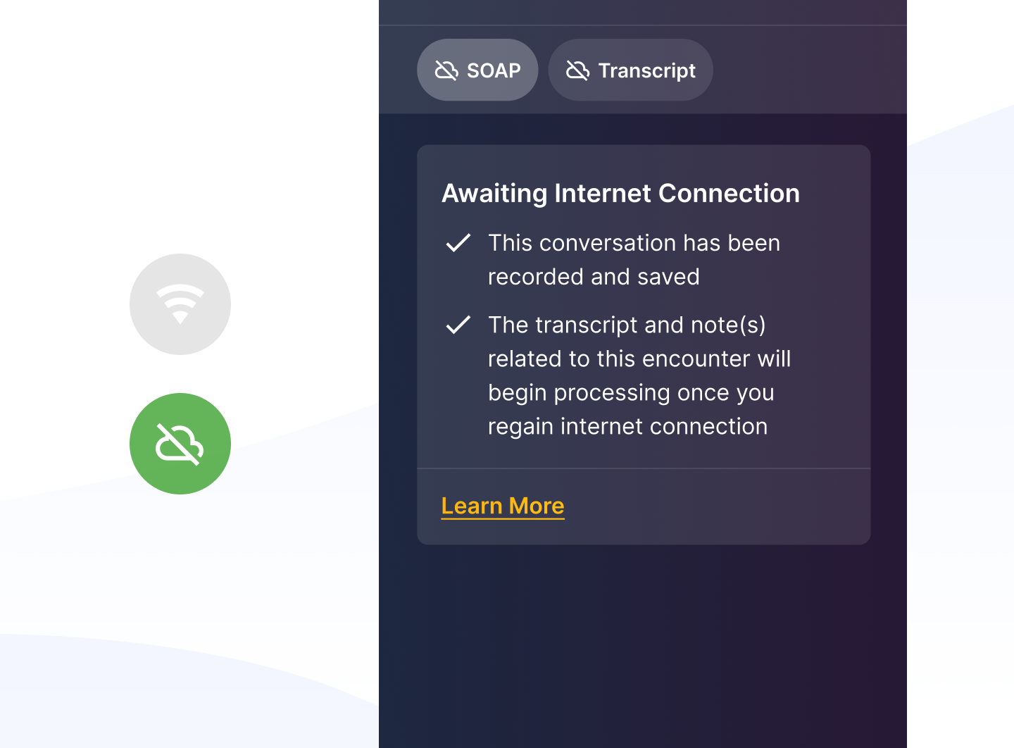 Avec le mode hors ligne, vous pouvez toujours terminer votre enregistrement comme d'habitude et obtenir la transcription de la séance. Veuillez noter qu'en cas de perte de connectivité, le traitement de votre transcription sera plus lent. Prévoyez un délai de 3 à 8 minutes (ou plus), selon la durée de l'enregistrement.